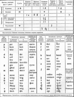 Если мы возьмем за единицу сравнения так наз. стандартное произношение А. Яз. в Англии, колониях и САСШ, не учитывая особенностей современных диалектов и наречий САСШ, то мы можем отметить: 1. почти полное отсутствие «мягких», т. е. палатализованных согласных, 2. отсутствие приглушения, за редкими исключениями, конечных согласных; так напр. head произносится с конечным d, а не t, как звучало бы это сочетание звуков в русском яз., 3. ассимиляция и диссимиляция в А. Яз. значительно реже осуществляется, чем в русском, 4. ударение в слове, так же как и в русском яз., экспираторное, но в отличие от русского не переходит с одного слога на другой, а прикреплено к определенному слогу. Различие артикуляционной базы и целого ряда фонетических навыков затрудняет усвоение звуковой формы английского языка.