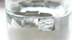 Lithium is soft enough to be cut with a knife, and it is the lightest of the metals of the periodic table. When cut, it possesses a silvery-white color that quickly changes to gray due to oxidation.[8] It also has a low density (approximately 0.534 g/cm3) and thus will float on water, with which it reacts easily. This reaction is energetic, forming hydrogen gas and lithium hydroxide in aqueous solution.[8] Due to its reactivity with water, lithium is usually stored in mineral oil or kerosene.[8]