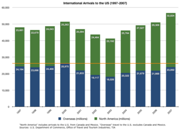 The travel and tourism industry in the United States was among the first commercial casualties of the September 11, 2001 attacks, a series of terrorist attacks on the US. In the US, tourism is either the first, second or third largest employer in 29 states, employing 7.3 million in 2004, to take care of 1.19 billion trips tourists took in the US in 2005. As of 2007, there are 2,462 registered National Historic Landmarks (NHL) recognized by the United States government. As of 2008, the most visited tourist attraction in the US is Times Square in Manhattan, New York City which attracts approximately 35 million visitors yearly. (www.wikipedia.org)
