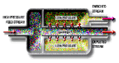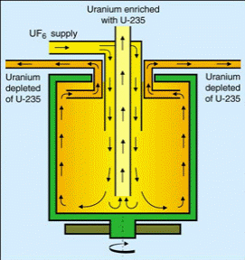 The centrifuge is a common technology used routinely in a variety of applications such as separating blood plasma from the heavier red blood cells. In the enrichment process, uranium hexafluoride gas is fed into rapidly spinning cylinders. In order to achieve as much enrichment in each stage as possible, modern centrifuges can rotate at speeds approaching the speed of sound. It is this feature that makes the centrifuge process difficult to master, since the high rate of revolution requires that the centrifuge be sturdy, nearly perfectly balanced, and capable of operating in such a state for many years without maintenance. Inside the rotating centrifuge, the heavier molecules containing U-238 atoms move preferentially towards the outside of the cylinder, while the lighter molecules containing U-235 remain closer to the central axis. The gas in this cylinder is then made to circulate bottom to top driving the depleted uranium near the outer wall towards the top while the gas enriched in U-235 near the center is driven towards the bottom. These two streams (one enriched and one depleted) can then be extracted from the centrifuge and fed to adjoining stages to form a cascade just as was done with the diffusers in the gas diffusion plants. A schematic diagram of such a centrifuge is shown in Figure 4 below.