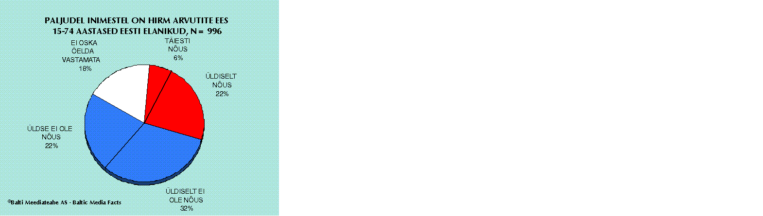 62% vastanuist nõustus väitega, et neil pole personaalselt mingit hirmu arvuti kasutamise ees. 16% vaidles sellele vastu. Arvuti kasutajate hulgas oli see protsent 90%. Huvitav on märkida, et ka arvutit mitte kasutajatest ja seda mitte plaanijatest 46% leiab, et neil pole mingit hirmu arvuti kasutamisel. Enim tunnistavad oma hirmu need, kes pole seni kasutanud, kuid plaanivad seda teha järgmise 12 kuu jooksul (23% ei olnud nõus väitega).