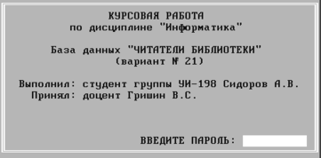 . Окно, показывающее данные о курсовой работе и ввод пароля.