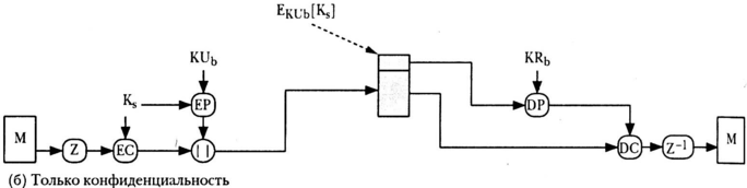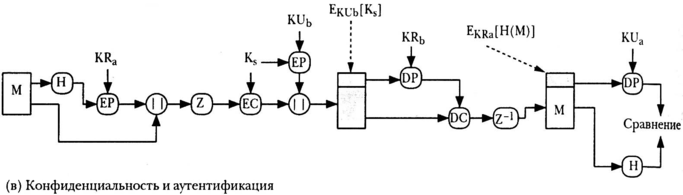 2. Профиль сообщения. 160-битоавый профиль сообщения, созданный с помощью SHA-1 и шифрованный с использованием личного ключа подписи отправителя (KRа). Профиль вычисляется для метки даты-времени подписи, связанной конкатенацией с порцией данных компонента сообщения. Включение метки даты-времени подписи в профиль обеспечивает защиту от атак воспроизведения сообщения. Исключение имени файла и метки даты-времени компонента сообщения гарантирует, что отделённая подпись будет в точности совпадать с подписью, добавляемой в префикс сообщения. Отделенные подписи вычисляются для файла, в котором нет никаких полей заголовка сообщения.