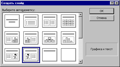 Выбор авторазметки для создаваемого слайда осуществляется в области Выберите авторазметку. Краткое описание авторазметки отображается в правом нижнем углу окна. Если выполнить двойной щелчок на образце авторазметки, появится новый слайд в режиме просмотра.