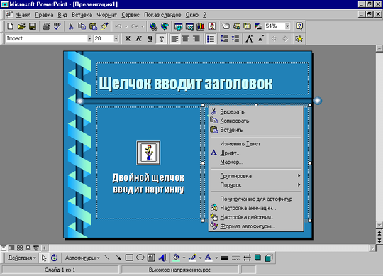 Пользователю предоставлена возможность накладывать одно текстовое поле на другое. Команда Порядок, находящаяся в контекстном меню поля, изменяет порядок следования перекрывающихся текстовых полей. Таким образом изменяют стандартную разметку слайдов.