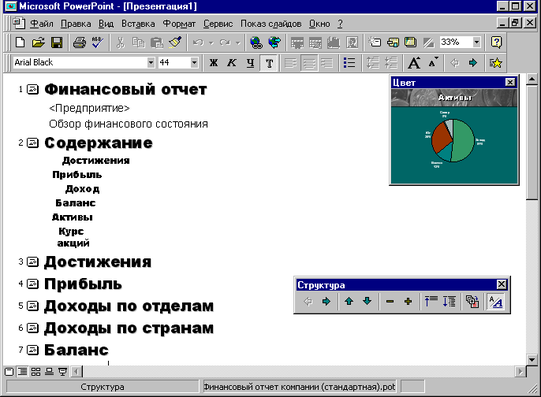 В режиме структуры презентация изображается в конспективном виде: только заголовки слайдов и содержащийся в слайдах текст. Структуру можно набрать в PowerPoint, создать на основе базовой структуры с помощью мастера автосодержания или импортировать из другого приложения, такого как Microsoft Word. В режиме структуры наиболее удобно разрабатывать и организовывать содержимое презентации.