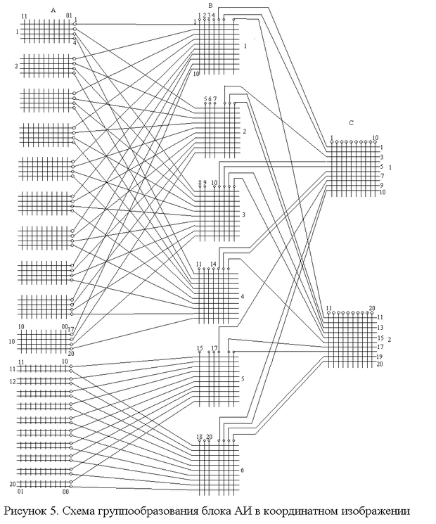 Таким образом между звеньями В и С образуется 20 ПЛ. В вертикали звена С включаются 20 входящих линий, причём каждой группе в десять входящих линий звена С доступны десять независимых ПЛ.