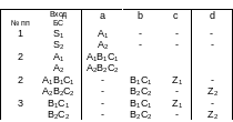 Пусть задана СРВ e1, e2, ..., em и для каждого РВ выполнено независимое построение СПп. Здесь S1, S2, ..., Sm начальные и Z1, Z2, ..., Zm заключительные состояния соответствующих СПп. Введем следующую проверочную таблицу (ПТ), на основе которой будем одновременно строить функцию разбора для всех РВ. ПТ содержит m+1 столбец, где 1,2,...,m столбцы, соответствуют буквам входного алфавита X, а 0-столбец представляет БС, именующие строки. Множество строк ПТ разбито на группы, каждая из которых может содержать до m строк по числу РВ, и представляет БС для всех РВ, полученных на некотором шаге построения функции разбора. В клетку пересечения строки и столбца записывается вычисленное значение функции разбора для данного БС и входной буквы.