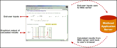 Примеры преобразования графиков в формулы (рис. 1 и другие подобные графики) можно скачать с сайта www.vpu.ru, а по одному из них уже можно поработать в режиме Webcalculations – смотри, вернее, зайди на сайт http://mas.mathsoft.com/mas/library/calc_DeltaP_A400.mcd или http://twt.mpei.ac.ru/mas/worksheets/Calc_DeltaP_A400.mcd. Технология работы Mathcad Application Server’а (MAS) показана на рис. 3, взятого с сайта http://www.mathcad.com/server/server.