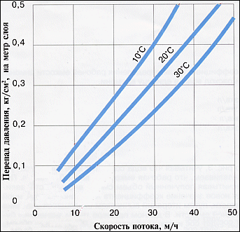 На рис. 1 в качестве примера показан график влияния скорости воды и ее температуры на удельное гидравлическое сопротивление в слое фильтрующего материала. Рисунок взят из технической документации одной известной фирмы (Purolite – см. www.purolite.com), поставляющей водоочистное оборудование.