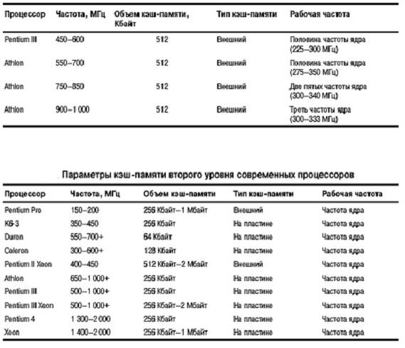 Сводная таблица по объемам, принципам организации и тактовым частотам кэш-памяти у процессоров от Intel и AMD: