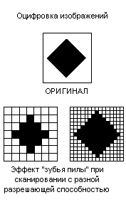 При сканировании оригинал разбивается на отдельные части одинакового размера - пиксели. В процессе сканирования каждому пикселю назначается свой адрес. Каждому пикселю по каждому адресу присваивается цифровое значение, соответствующее уровню серого полутона, зарегистрированного считывающим элементом; это называется оцифровкой. Оцифровка штриховых оригиналов относительно проста. В процессе сканирования пиксель может быть либо белым, либо черным. Однако и здесь может быть потеря информации. Например, пиксель содержит 50% белого и 50% черного, тогда требуется выбор чего-то одного. Это приводит к получению эффекта "зубья пилы".
