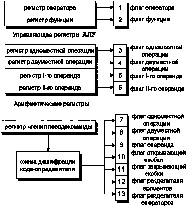 В отличие от обычного набора универсальных регистров арифметические регистры формульного процессора в силу их соответствия флагам загрузки несколько более специализированы. Хотя их основным назначением по-прежнему является временное сохранение кодов операций и операндов, каждый из них ориентирован на сохранение своего вида элементов формульного кода, которым может быть код оператора, функции, одноместной или двуместной арифметико-логической операции или их операнды (рис.4).