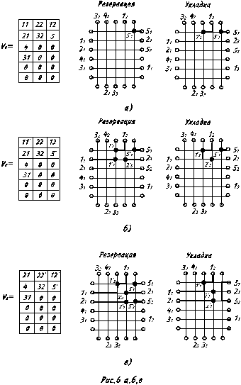 При заполнении 2-й магистрали (рис.6б) вначале резервируется терминал 11 при этом ДС11 трансформируется в ДС11=(11,12). Для резервации терминала 23 формируется свободный столбец. Для этого терминалы 12 ДС11 и 12 ДС12, поскольку они уже связаны, объединяются в терминал 12, а столбец, занятый терминалом 12, освобождается. ДС12=(12,13)трансформируется в ДС12=(12,13). После этого терминал 23 резервируется терминалом 23, а ДС22=(22,23) трансформируется в ДС22=(22,23). При просмотре Vk полностью во 2-ю магистраль помещается только ДС11, которое удаляется из Vk.