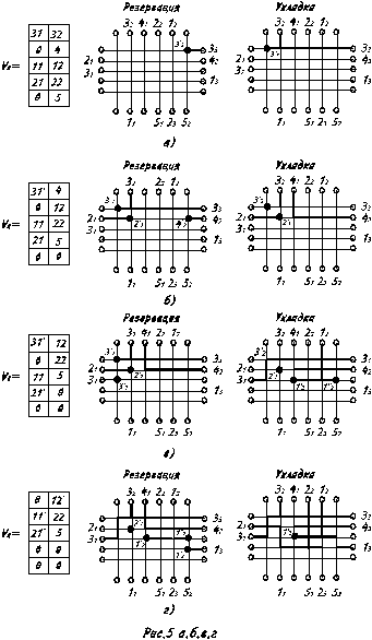 Затем просматривается матрица Vk. ДС31 не помещается, ДС4 помещается полностью и удаляется из Vk , которое потом сжимается. На рис.5в,г,д, показан процесс укладки 3, 4, и 5-й магистралей.