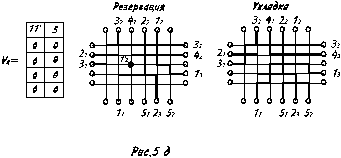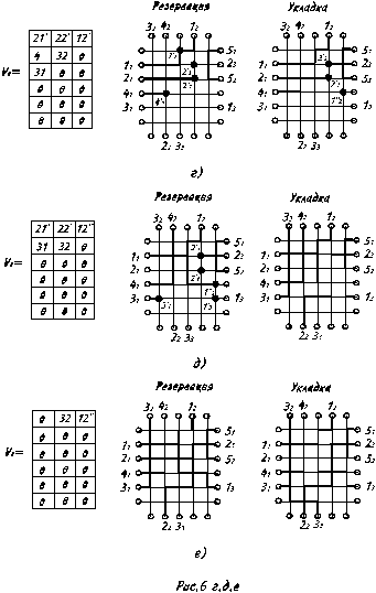 При заполнении 5-й магистрали (рис.6д) резервируются терминалы 31.и 13. ДС31=(31,32) трансформируется в ДС31=(31,32), а ДС12=(12,13) в ДС12=(12,13). При просмотре Vk полностью помещаются ДС21, ДС22, ДС31, ДС12, которые удаляются из Vk.