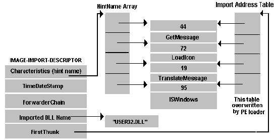 Теперь рассмотрим структуру самой таблицы импорта. Данная таблица находится в секции импорта (что такое секции в .exe-фале - см описание формата) и содержит всю информацию, необходимую загрузчику для подключения всех DLL и определения адресов вызываемых программой функций. Однозначно определить расположение таблицы импорта по имени секции не представляется возможным, т.к. в зависимости от компилятора данные имена значительно отличаются. Например, компилятор Borland C++ 5.5 (bcc32.exe) именует секцию импорта как ".idata"; компилятор от Microsoft хранит таблицу импорта в секции с именем ".text".*