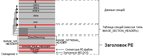 Так как структура исполнительного файла является довольно громоздкой, вникать подробно в описание каждого её элемента мы не будет, лишь кратко остановимся на необходимых нам элементах. Все файлы программ для Windows имеют следующий формат (см. рис. 1):