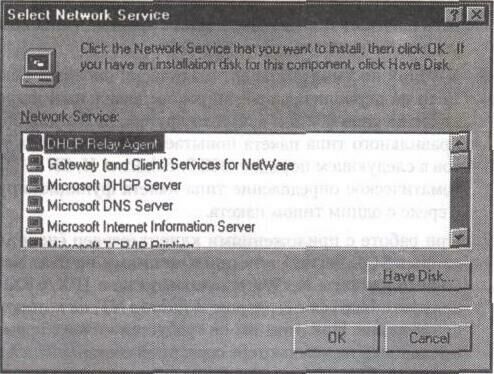 Служба шлюза для NetWare (GSNW) — необязательная сетевая служба, являющаяся частью Windows NT Server 4. Это означает, что она входит в дистрибутив продукта, но не устанавливается по умолчанию при установке операционной системы. Чтобы установить GSNW, запустите приложение Network в панели управления, перейдите на вкладку Services и затем нажмите кнопку Add. Открывается диалоговое окно, изображенное на рис. 7.1, в котором GSNW находится во второй строке списка. Чтобы начать установку GSNW, выделите ее в списке и нажмите кнопку О К в нижней части окна. Вам будет предложено вставить компакт-диск с NT Server.