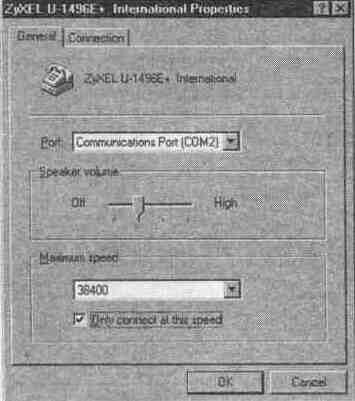 Часто для более устойчивой работы приложений требуется, чтобы скорость передачи по используемому порту была постоянной и не изменялась в течение сеанса связи, даже несмотря на изменение скорости передачи модемом в канале. Это условие, в частности, относится к программам, использующим в своей работе Fossil-драйверы. Такая "залочка" (lock — замок, запирать) порта, как правило, достигается подачей команды АТ&В1 или явным заданием скорости порта в программе. В Windows'95, характеризующейся общим "отчуждением железа" от пользователя, фиксация скорости порта осуществляется установкой флажка "Only connect at this speed" в поле "Maximum speed" меню General (Control Panel\Modems\General) (рис. 13.1).
