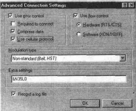 В табл. 13.1 приведен протокол (неудачного) соединения для конфигурации модема, соответствующей установкам параметров на рис. 13.1, 13.2, и 13.6. При установленном флажке "Record a log file" протокол записывается в файл ..\Windows\ModemLog.txt (рис. 13.6).