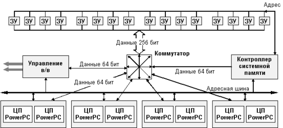 В архитектуре PowerScale (рис. 4.1) основным средством оптимизации доступа к разделяемой основной памяти является использование достаточно сложной системной шины. В действительности эта "шина" представляет собой комбинацию шины адреса/управления, реализованной классическим способом, и набора магистралей данных, которые соединяются между собой посредством высокоскоростного матричного коммутатора. Эта система межсоединений получила название MPB_SysBus. Шина памяти используется только для пересылки простых адресных тегов, а неблокируемый матричный коммутатор - для обеспечения более интенсивного трафика данных. К матричному коммутатору могут быть подсоединены до 4 двухпроцессорных портов, порт ввода/вывода и подсистема памяти.