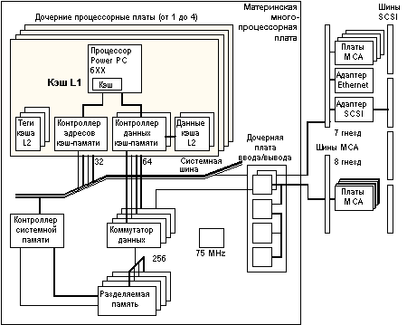 Ниже на рис. 4.5 показана схема, представляющая системные платы, разработанные компанией Bull, которые используются для физической реализации архитектуры PowerScale.