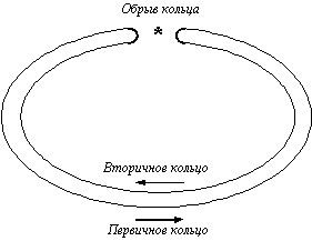 В случае какого-либо вида отказа, когда часть первичного кольца не может передавать данные (например, обрыв кабеля или отказ узла), первичное кольцо объединяется со вторичным (рисунок 2.1), образуя вновь единое кольцо. Этот режим работы сети называется Wrap, то есть "свертывание" или "сворачивание" колец. Операция свертывания производится силами концентраторов и/или сетевых адаптеров FDDI. Для упрощения этой процедуры данные по первичному кольцу всегда передаются против часовой стрелки, а по вторичному - по часовой. Поэтому при образовании общего кольца из двух колец передатчики станций по-прежнему остаются подключенными к приемникам соседних станций, что позволяет правильно передавать и принимать информацию соседними станциями.