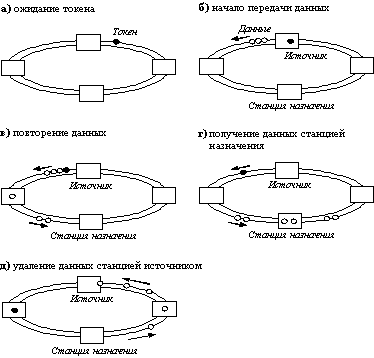 Кольца в сетях FDDI рассматриваются как общая разделяемая среда передачи данных, поэтому для нее определен специальный метод доступа. Этот метод очень близок к методу доступа сетей Token Ring и также называется методом маркерного (или токенного) кольца - token ring (рисунок 2.2, а).