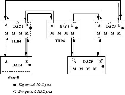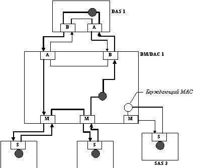Концентратор DAC4 подключен по классической схеме Dual Homing. Эта схема рассчитана на наличие у такого концентратора только одного MAC-узла. При подключении портов A и B концентратора DAC4 к портам М концентратора DAC1 между этими портами устанавливается физическое соединение, которое постоянно контролируется физическим уровнем PHY. Однако, в активное состояние по отношению к потоку кадров по сети переводится только порт B, а порт A остается в резервном логическом состоянии. Предпочтение, отдаваемое по умолчанию порту В, определено в стандарте FDDI.
