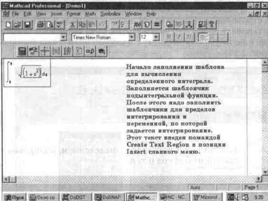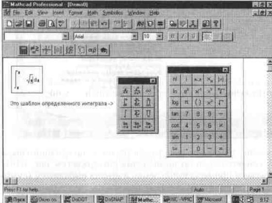 Для ввода данных можно указать курсором мыши на нужный шаблон данных и, щелкнув левой ее клавишей для фиксации места ввода, ввести данные. На рис. 1. 12 отражен момент ввода под знаком квадратного корня выражения для задания подынтегральной функции.