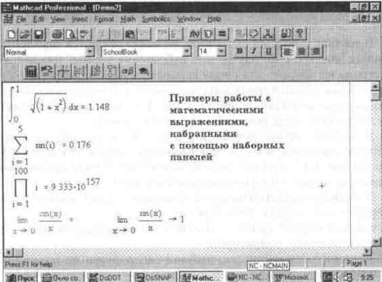 рирование. Установив знак равенства после полученного выражения, можно сразу увидеть результаг вычисления интеграла (см. рис. 1. 13). На этом рисунке показаны примеры вычисления и других выражений (суммы, произведения и предела функции) с набором их с помощью палитр. Там же даны и примеры задания текстовых комментариев.