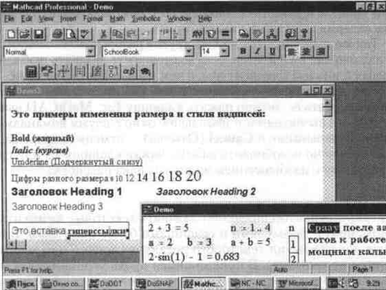 Выделение используется также для копирования в буфер обмена и организации гиперссылки. Гиперссылка в MathCAD 7. 0 дает связь выделенного текстового фрагмента с некоторым файлом. Для этого вначале фрагмент выделяется, а затем нажимается кнопка панели инструментов Insert Hyperlink. В появившемся простом окне надо указать полное (с путем) имя файла, который будет загружаться и отображаться в момент активизации фрагмента — гиперссылки. Можно также задать сообщение об ошибке, если файл не будет найден. На рис. 1. 14 показан случай, когда с гиперссылкой связан файл Demo с демонстрацией работы MathCAD, на рисунке виден угол окна с документом этого файла.