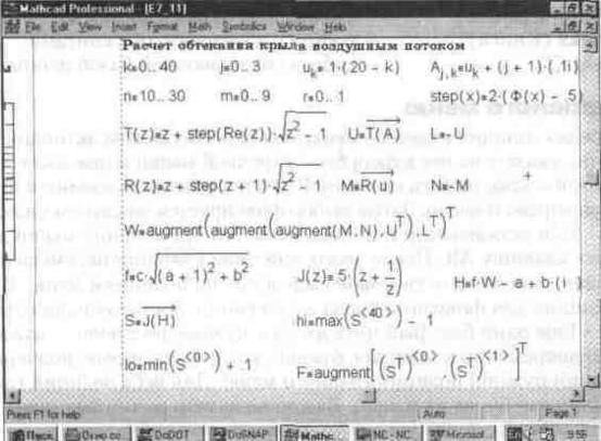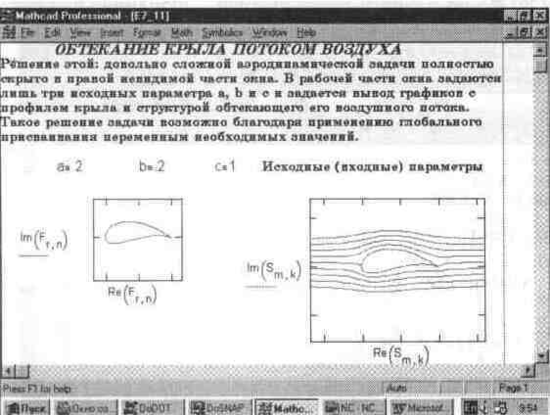 Можно разместить некоторые вспомогательные вычисления в правой, невидимой, части окна, а в левую, видимую, вынести задание исходных данных и вывод результатов расчетов Этот прием часто используется в пакетах с примерами применения системы, а также в учебно-демонстрационных программах На рис 118 показан пример подобного решения довольно сложной аэродинамической задачи по построению профиля крыла самолета и линий обтекания его воздушным потоком