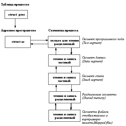 На аппаратно-независимом уровне сегментная организация виртуальной памяти каждого процесса описывается структурой as, которая содержит указатель на список описателей сегментов, общий текущий размер виртуальной памяти (т.е. суммарный размер всех существующих сегментов), текущий размер физической памяти, которую процесс занимает в данный момент времени, и наконец, указатель на некоторую аппаратно-зависимую структуру, данные которой используются при отображении виртуальных адресов в физические. Описатель каждого сегмента (несколько огрубляя) содержит индивидуальные характеристики сегмента, в том числе, виртуальный адрес начала сегмента (каждый сегмент занимает некоторую непрерывную область виртуальной памяти), размер сегмента в байтах, список операций, которые можно выполнять над данным сегментом, статус сегмента (например, в каком режиме к нему возможен доступ, допускается ли совместное использование и т.д.), указатель на таблицу описателей страниц сегмента и т.д. Кроме того, описатель каждого сегмента содержит прямые и обратные ссылки по списку описателей сегментов данной виртуальной памяти и ссылку на общий описатель виртуальной памяти as.