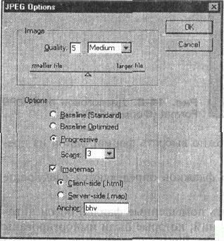 Для сохранения документа в формате JPEG используется команда Export... (Экспортировать...) меню File (Файл), которая после присвоения имени файла в одноименном диалоговом окне выводит на экран еще одно диалоговое окно JPEG Options (Параметры файла JPEG) (рис. 14-9), в котором определяются некоторые параметры документа.