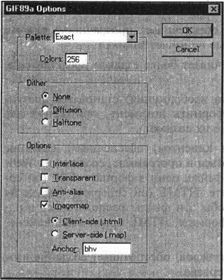 Переключатель Client-side (.html) (Для клиентов) обеспечивает создание изображения, которое может использоваться в программах, создающих Web-страницы. В этом случае создаются два файла: один в формате .GIF (он содержит изображение) и другой в формате .HTML (он содержит ссылку на файл с изображением). Необходимо, чтобы эти файлы располагались в одной и той же папке. Название файла в формате .HTML может быть изменено в поле Anchor (Привязка).