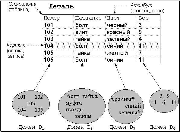 Л егко заметить, что отношение является отражением некоторой сущности реального мира (в данном случае - сущности “деталь”) и с точки зрения обработки данных представляет собой таблицу. Поскольку в локальных базах данных каждая таблица размещается в отдельном файле, то с точки зрения размещения данных для локальных баз данных отношение можно отождествлять с файлом. Кортеж представляет собой строку в таблице, или, что то же самое, запись. Атрибут же является столбцом таблицы, или - полем в записи. Домен же представляется неким обобщенным типом, который может быть источником для типов полей в записи. Таким образом, следующие тройки терминов являются эквивалентными: