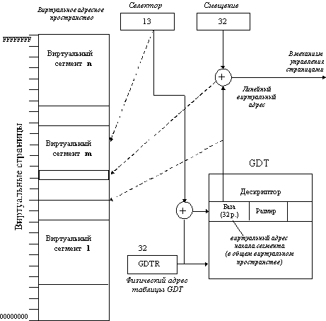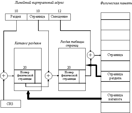 Преобразование линейного виртуального адреса в физический происходит следующим образом (рисунок 2.24). Поле номера виртуальной страницы (старшие 20 разрядов) делится на две равные части по 10 разрядов - поле номера раздела и поле номера страницы в разделе. С помощью номера физической страницы, хранящей каталог и смещения в этой странице, задаваемого полем номера раздела, процессор находит дескриптор виртуальной страницы раздела. В соответствии с атрибутами этого дескриптора определяются права доступа к этой странице, а также наличие ее в физической памяти. В случае ее отсутствия происходит страничное прерывание, и операционная система должна в этом случае переместить ее в память. После того, как нужная страница находится в памяти, для определения адреса элемента данных используется смещение, определяемое полем номера страницы линейного виртуального адреса.