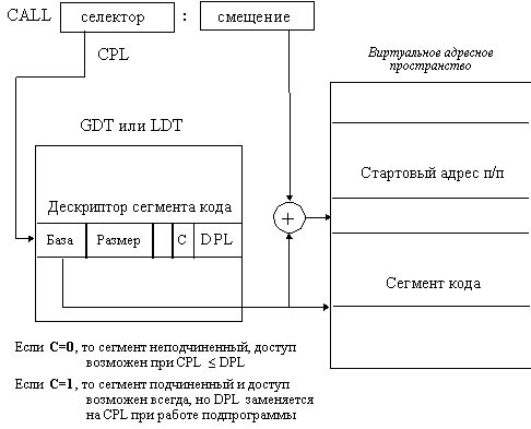 Для вызова подпрограммы, код которой находится в другом сегменте (который может принадлежать библиотеке, другой задаче или операционной системе), процессор i386 предоставляет 2 варианта вызова, причем оба используют защиту с помощью прав доступа.