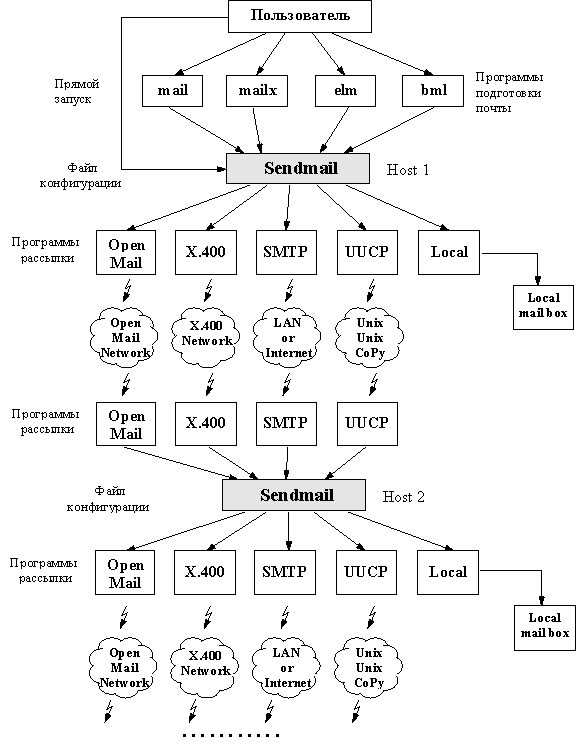 Рис. 3.1. Схема почтового взаимодействия на базе программы Sendmail