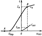 электронной лампы соответствуют определенные положения рабочей точки на анодно-сеточной характеристике (рис. 7.1). Лампа закрыта (режим отсечки), когда напряжение на сетке uсет меньше порогового Uпор и рабочая точка (точка А) находится на горизонтальном участке характеристики. Анодный и сеточный токи лампы при этом практически равны нулю. Когда uсет > Uпор, лампа открыта. В анодной цепи протекает ток Ia, а если при этом напряжение на сетке положительное, то имеет место сеточный ток Iсет (точка В). Участок характеристики между этими двумя точками нельзя аппроксимировать отрезком прямой линии.