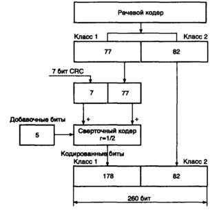Канальное кодирование - для канального кодирования используется сверточный код со скоростью r = 1/2. В этом процессе пакет в 159 бит от речевого кодера разбивается на две группы бит: класс 1-77 бит, класс 2-82 бита. В группе бит 1 класса осуществляется указанное сверточное кодирование, причем 7 бит используются для обнаружения ошибок, биты второго класса передаются без кодирования. В результате преобразований в канальном кодере речевой фрагмент 20 мс представляется 260 битами, что соответствует скорости передачи 13 кбит/с.