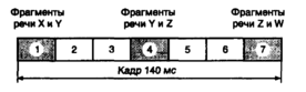 Перемежение - пакет из 260 бит подвергается перемежению. Любой речевой фрагмент разбивается на две равные части. Одна из этих частей передается в исходном окне фрагмента, а другая - в окне, сдвинутом на три окна (например, в окнах I" и 4). Следующий фрагмент речи, длительностью 20 мс, передается в окне 4 и в окне 1 в следующем кадре.