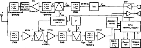 Передающий и приемный блоки выполнены по классической схеме. Приемное устройство представляет собой супергетеродинный приемник с двойным преобразованием частоты. Входной сигнал поступает в полосовой фильтр на ПАВ, выделяющий принимаемый сигнал и ослабляющий помехи. Отфильтрованный сигнал fС (869 – 894 МГц) поступает в малошумящий усилитель (МШУ) и после усиления подается в смеситель. На второй вход последнего с синтезатора частот поступает сигнал гетеродина, fПРМ (914 – 939 МГц). Полученный сигнал первой промежуточной частоты fПР (45 МГц) поступает в усилитель первой промежуточной частоты УПЧ1 и после усиления фильтруется полосовым фильтром на ПАВ. Отфильтрованный сигнал fПР поступает во второй смеситель. В него же с гетеродина Г поступает сигнал fГ Полученный в результате гетеродинирования сигнал второй промежуточной частоты fПР2 частотой 450 кГц фильтруется полосовым фильтром на ПАВ и усиливается усилителем УПЧ2. Усиленный до необходимого уровня сигнал поступает в фазовый демодулятор, где выделяются сигналы управления и речевой сигнал. Последний поступает в усилитель УНЧ и далее — на громкоговоритель. Сигналы управления обрабатываются процессором CPU.