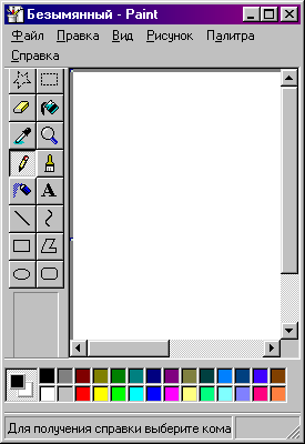 Окно графического редактора Paint имеет стандартный вид (см. рис. № 7). В левом верхнем углу выводится имя файла рисунка, и затем название редактора Paint. В меню редактора входят команды “Файл”, “Правка”, “Вид”, “Рисунок”, “Параметры” и “?”. В палитру инструментов входят кнопки “Выделение произвольной области” и “Выделение”, “Ластик” и “Заливка”, “Выбор цветов” и “Масштаб”, “Карандаш” и “Кисть”, “Распылитель” и “Надпись”, “Линия” и “Кривая”, “Прямоугольник” и “Многоугольник”, “Эллипс” и “Скругленный прямоугольник” (по порядку сверху вниз). В левом нижнем углу расположена Панель цветов. При некоторых операциях с рисунком на экране временно появляются и другие Панели. Управлять работой в Paint можно посредством меню и панели инструментов. Существуют команды, вызываемые или только через меню, или только через панель инструментов.