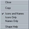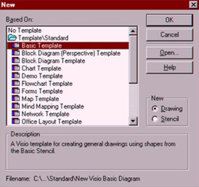 Теперь начнем более подробно рассматривать данную программу, все ее функции, кнопки, возможности и т.д. Окно для редактирования изображений занимает самое большое пространство на экране. Оно представляет собой визуально лист в клеточку, в котором производятся все операции по редактированию. Окно для редактирования находится как бы поверх специально фона, на котором нельзя рисовать и производить какие либо действия. Само окно имеет заданные границы для редактирования. Для более точного построения вокруг окна редактирования имеется линейка, она позволяет очень точно расположить объекты на плоскости и провести расчеты. Размеры окна для редактирования могут быть разными по размеру и чтобы комфортно переходить при больших масштабах рисунка от одной части к другой, как и всех стандартных программах под операционную систему Windows имеются полосы прокрутки. Немного левее окна редактирования, располагается окно для работы с трафаретами (если это окно было выбрано по умолчанию при начальной загрузке или вызвано при помощи кнопки на панели инструментов), здесь располагаются готовые блок схемы, фигуры, стрелки, изображения и т.д. Для того чтобы исходное изображение в трафарете появилось в окне для редактирования нужно, мышкой перейти в окно трафарета и выбрать нужный нам объект. После того как объект выбран, установив курсор на нем, мы нажимая левую клавишу мыши и держа ее переносим это изображение из одного окна в другое. Так же как и в окне для редактирования здесь присутствуют полосы прокрутки. Так же можно открыть сразу несколько трафаретов, тогда рядом с кнопкой названия данного трафарета появятся и другие. Если нажать правой клавишей мыши на кнопке названия данного трафарет появится подменю, в котором производятся дополнительные команды. Команда Activate означает что в данный момент это окно активно, Float – превращает меню трафарета в отдельное окно, которое можно или свернуть или закрыть (благодаря этой функции можно заметно увеличить размеры для окна редактирования), Switch Sides – позволяет перенести меню из левой стороны в правую, Close – закрывает меню трафарета. Помимо того что можно щелкнуть мышкой на кнопке денного трафарета, так же можно щелкнуть и на самом объекте в трафарете. В этом случае тоже появляется вспомогательное меню. Команда Close закрывает заданный трафарет, Copy – копирует данный фрагмент, Icons and Names – показывает значки и имена к ним, Icons Only – показывает только иконки, Names Only – показывает только имена иконок, Shape Help – помощь по данному фрагменту. Так же можно самому создавать панели для трафаретов и заносить туда понравившиеся фигуры. В процессе работы надписи могут иметь полупрозрачный цвет, вместо черного (цвета по умолчанию для активных приложений). Если надпись написана полупрозрачным цветом, то в данном случае это действие нельзя применить или оно уже сделано. Например, нельзя сделать активным меню если оно уже активное.