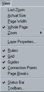 В меню View находятся команды: Last Zoom – последний масштаб изображения, Actual Size – истинный размер, Page Width – ширина страницы, Whole Page – целая страница, Zoom – масштаб изображения (изменяется от 50 до 400), Layer Properties – свойства уровня, Rulers – убрать или включить линейку, Grid – убрать или включить сетку на листе, Guides – руководства on/off, Connection Points – показать или убрать контрольные точки, Page Breaks – разграничитель страницы, Status Bar – строка состояния, Toolbars – включить или выключить инструментальную панель.