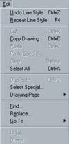 В меню Edit можно увидеть такие команды как: Undo Line Style – отменить последнее действие, Repeat Line Style – повторить отмененное действие, Cut – вырезать объект(ы), Copy Drawing – копировать все объекты рабочего стола (здесь также применима команда Copy – копировать один или выделенные объекты), Paste –вставить скопированный или вырезанный объект(ы), Paste Special –специальные вставки, Clear – удаление объекта, Select All – выделить все, Duplicate – создать дубликат объекта, Select Special –специальное выделение, Drawing Page – это команда содержит в себе 4 настройки: Properties – свойства страницы , Size/Scale – размеры, Delete – удаление всех графических объектов из окна редактирования, Reorder – переупорядочить, Find – поиск, Replace – нахождение и замена текста, Go To – переход к странице, Links – ссылка, Object – объект.