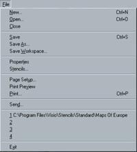 Опишем в дальнейшем самые главные функции всего меню в целом. В меню File можно увидеть такие команды как: New – это создание нового рабочего файла, Open – открывает готовый файл над которым вы уже работали, Close – закрывает текущий рабочий файл (если вы не сохранили все работу которую вы сделали, то по умолчанию вам предложат сохранить вашу работу), Save – сохранить все изменения и вообще все работу в целом, Save as – сохранить все изменения с различными расширениями (это нужно для того чтобы ваши данные созданные в программе Visio, можно было перенести в другие программы), Save Workspace – сохранение рабочей версии , Properties – задает свойства данного файла (имя создателя, ключевые слова, краткое описание и т.д.), Stencils – открыть в окне шаблонов еще один шаблон, Page Setup – параметры страницы, Print Preview – краткий просмотр страницы перед тем как распечатать, Print – печать, Send – отсылает всю вашу работу по электронной почте, Специальное меню которое запоминает с какими последними 4 рабочими файлами вы работали, Exit – выход из программы.
